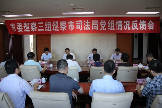 2017年6月23日下午,市委巡察工作领导小组成员、巡察办主任张荣宝,市委巡察三组组长李元巍一行4人,到市司法局专题反馈巡察情况。市司法局党组书记、局长林培新主持反馈会,市纪委驻市委政法委纪检组组长吕春香、常务副组长吴俊鹏,市司法局领导班子成员及其他市管干部,局机关各科室、直属各事业单位主要负责人参加会议。