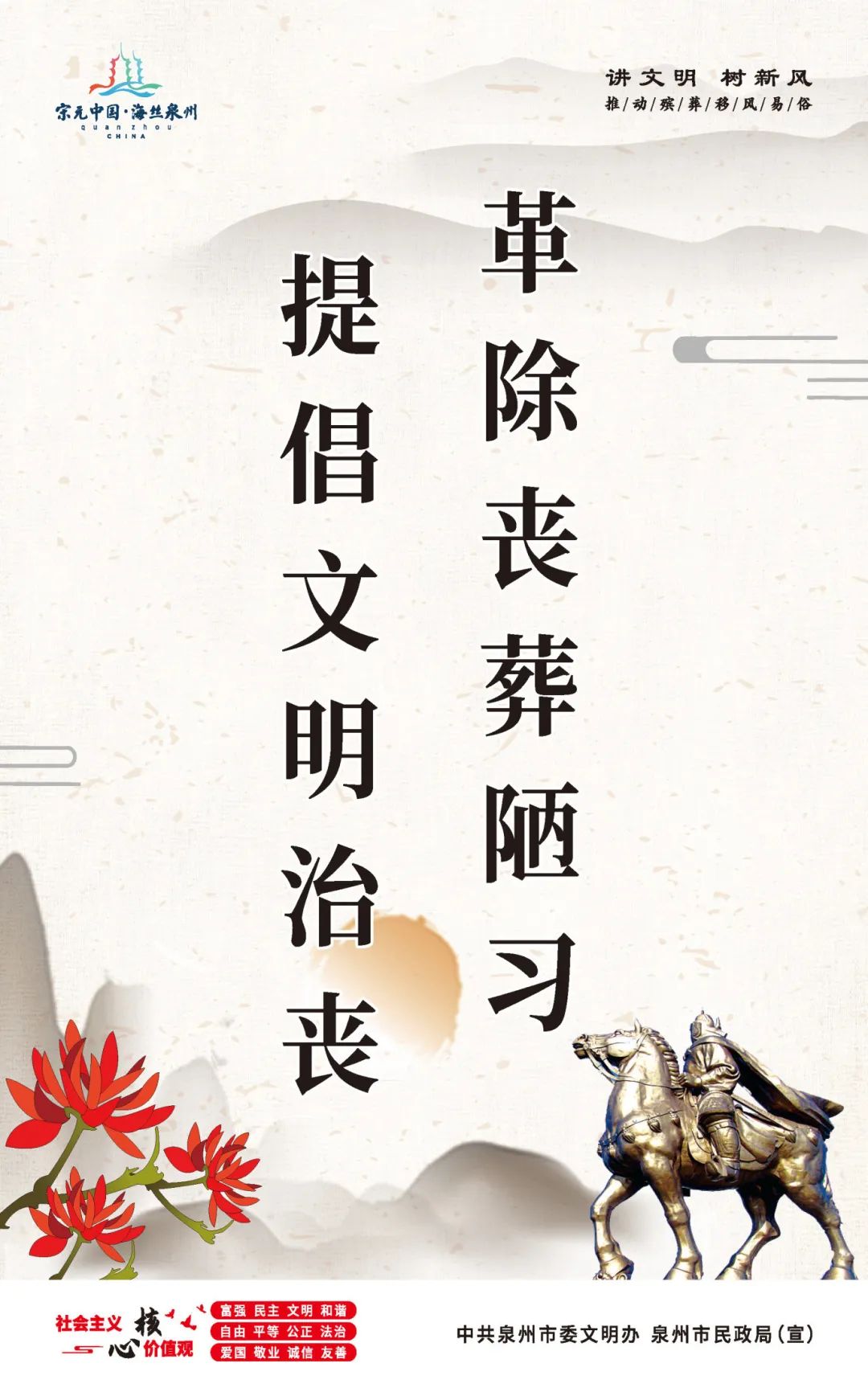 清明临近,泉州市委文明办积极倡导文明殡葬,通过发布清明节文明祭扫倡议书、全市各地网络祭扫平台入口、公益海报等多种形式,积极倡导绿色低碳祭扫方式,引导广大市民自觉摒弃陈规陋习,践行殡葬移风易俗,树立文明新风,努力营造文明和谐的清明祭扫氛围。